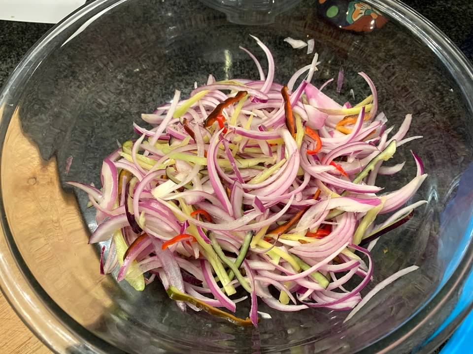 Here is the peppers, red onion and lime all thinly sliced in a big bowl.