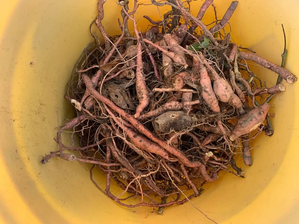 Tricia came and joined me and we hand-sorted the sweet potatoes into four different buckets. Once sorted, we'll hang them for curing.