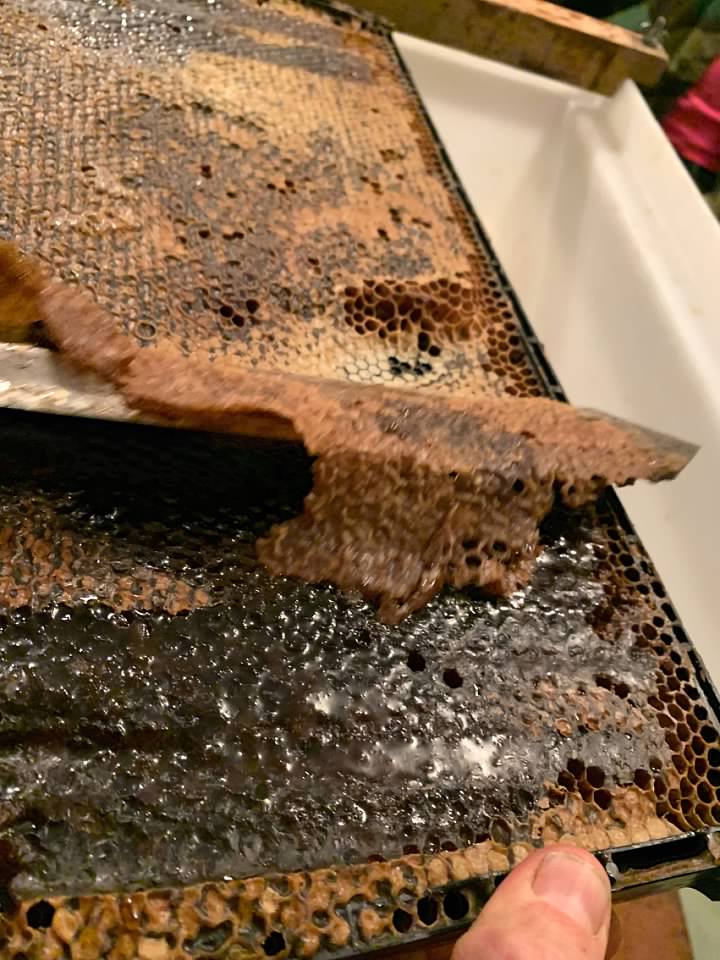 The bees have capped it with wax. The frames are heavy! I picked up a box of frames full of honey and struggled to get it back to the truck.