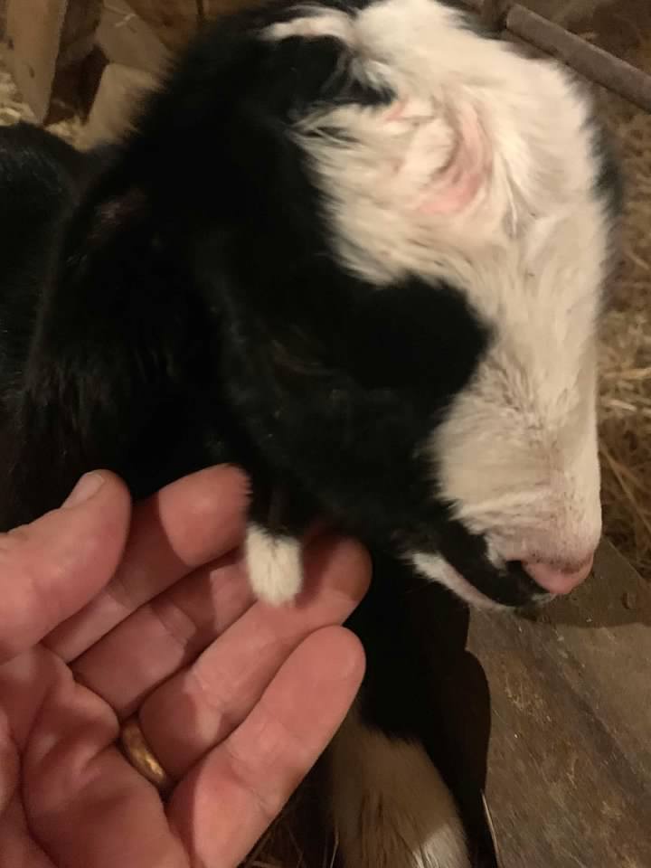 The little doeling has wattles, like Agnes. Wattles are dangling 'tails' of skin that hang off of the neck of some goats. The doeling's wattles are both black with white tips. Scientists don't know what the purpose of wattles is. They just dangle and look cute.