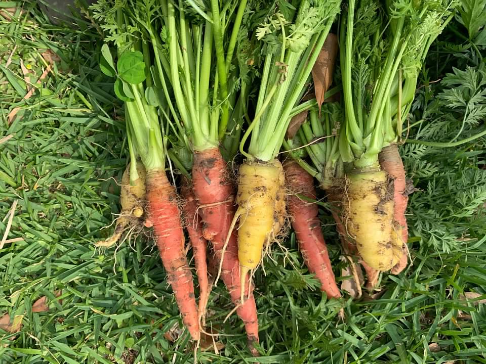 Then there's the carrots. I replanted a couple of rows of carrots. The existing carrots were hurt, but are just now maturing. Atomic Red Carrots and Cosmic Purple Carrots. For supper last night, I pulled some Danvers Carrots and some Uzbek Yellow Carrots.