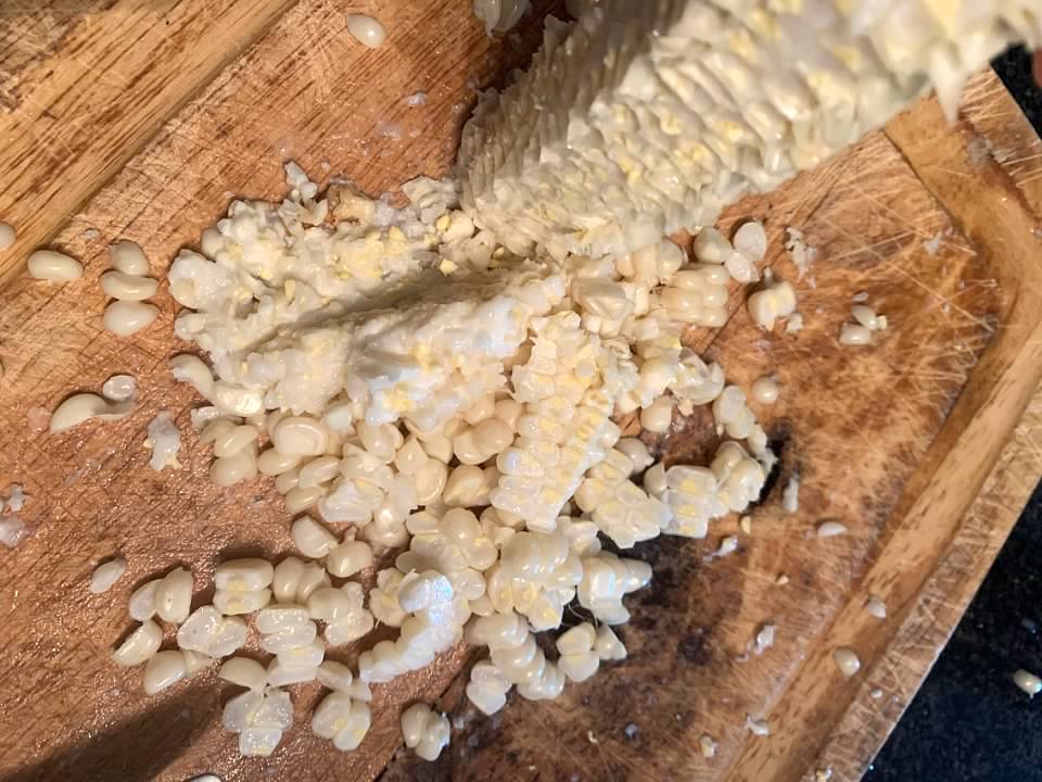 Using a sharp chef's knife, I cut the corn off the cob.  Then I use a butter knife to scrape the cob, getting the 'milk' and remaining corn off the cob.