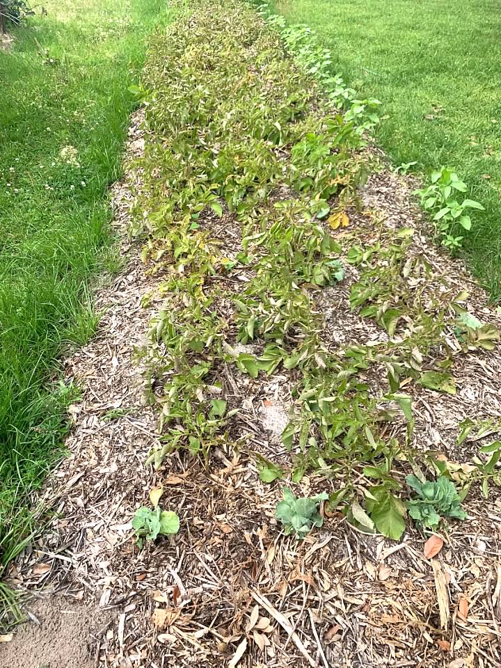 They took on this sickly, yellowish hue.  All growth stopped.  Some of the potatoes withered and died.  I hate to even look at what's left of them.  When I walk out that way to check on the bees, I avert my eyes.