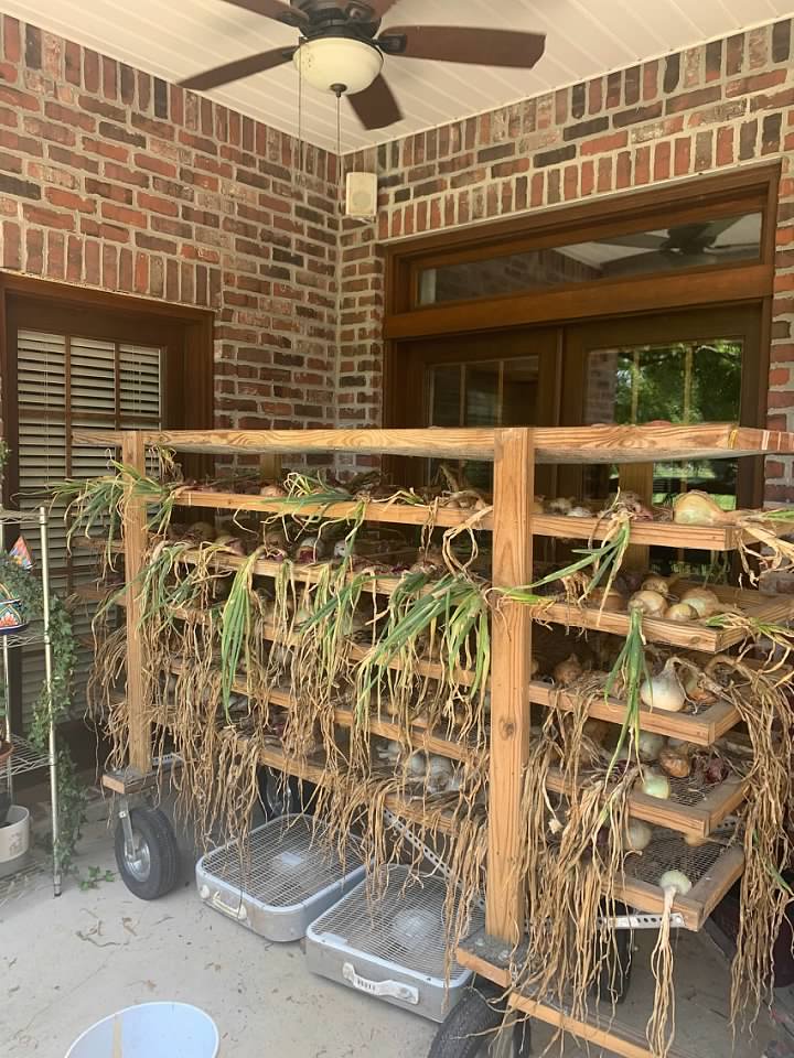 We dug all of the potatoes and now have pulled all of the onions. All of them are curing on our 'curing wagon.' A friend from church gave it to me after he built himself a bigger one. I put the onions and potatoes on the racks and have the ceiling fan blowing from the top and two box fans blowing from beneath. As the onion tops turn brown, I clip the tops and the roots off. We check them closely because sometimes a few will turn soft. Before they go bad, we bring the soft ones inside, cut off the bad parts and eat them.