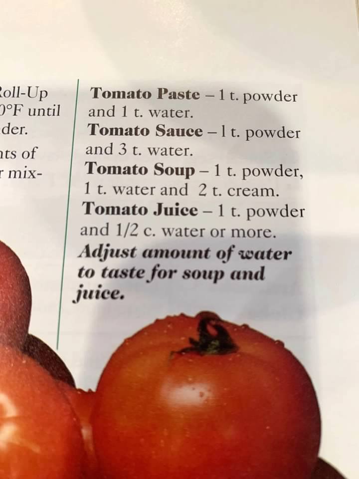 If you mix equal parts powder and water, you get tomato paste.  1 part powder to 3 parts water, and you get tomato sauce.  You can also make soup and juice.  We are canning tomato powder up as well.