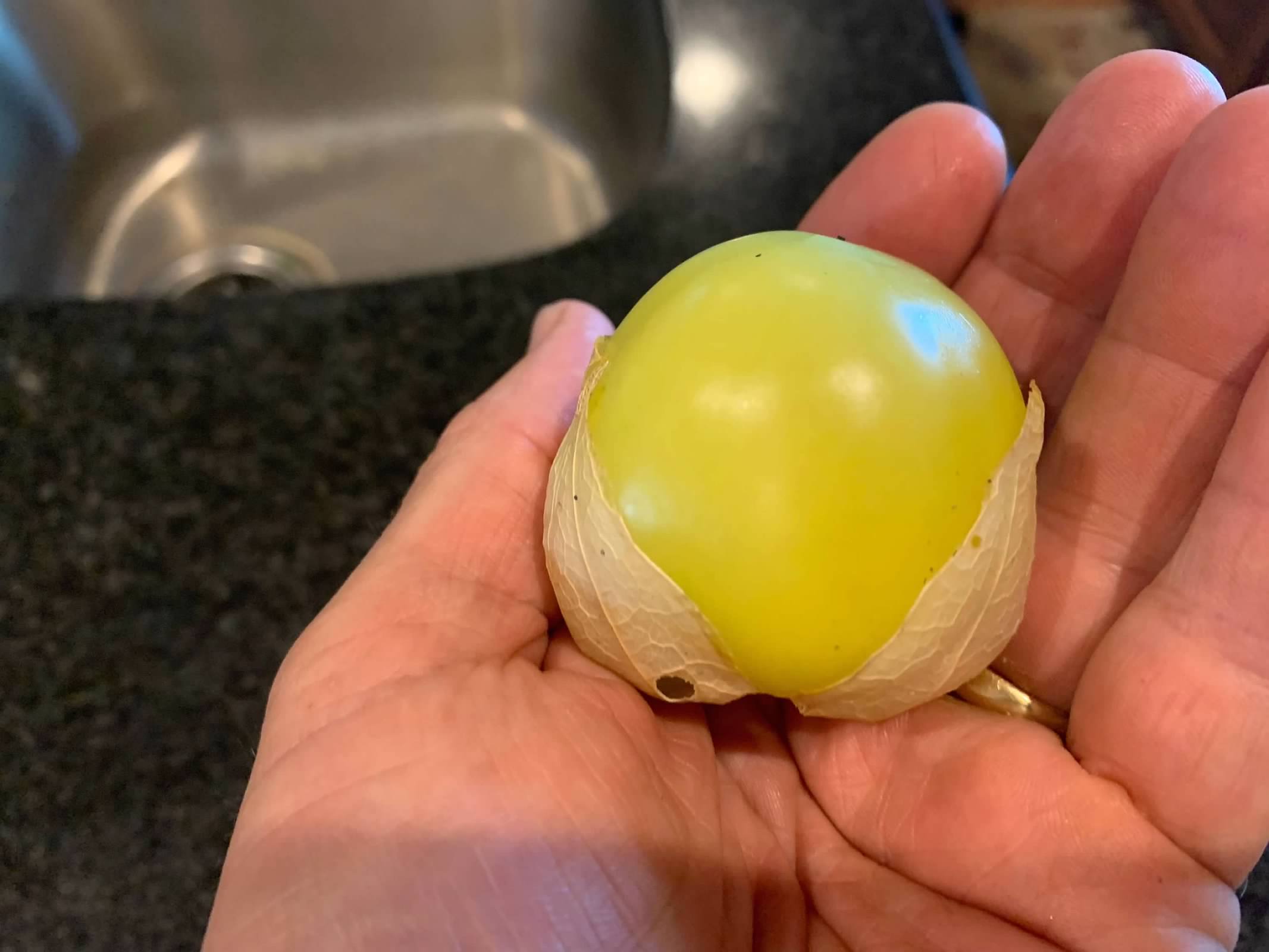 Tomatillos sort of look like a greenish-yellow tomato, but with a husk on it. We picked a basket full of them:
