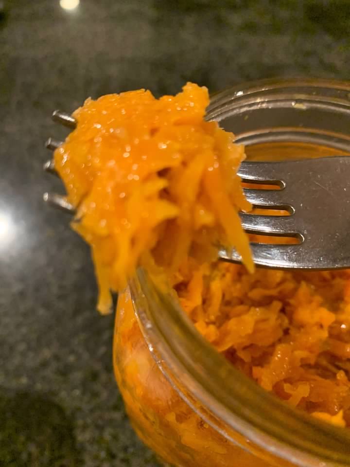 Another thing that we do is make Fermented Ginger Carrots. We shred carrots in a food processor and put into a large bowl. Then we add grated fresh ginger into the bowl with the carrots. Then we add a third cup of whey. We use a meat tenderizing mallet to mash the carrots, making the juices come out. We use a spoon to fill quart sized canning jars with the carrots, pressing them into the jar so that they are packed tightly. Pour the liquid so that it covers the carrots and put a lid on the jar, loose. We leave out on the counter for 3 days and then put in the fridge. We find the longer you leave it, the better the flavor.