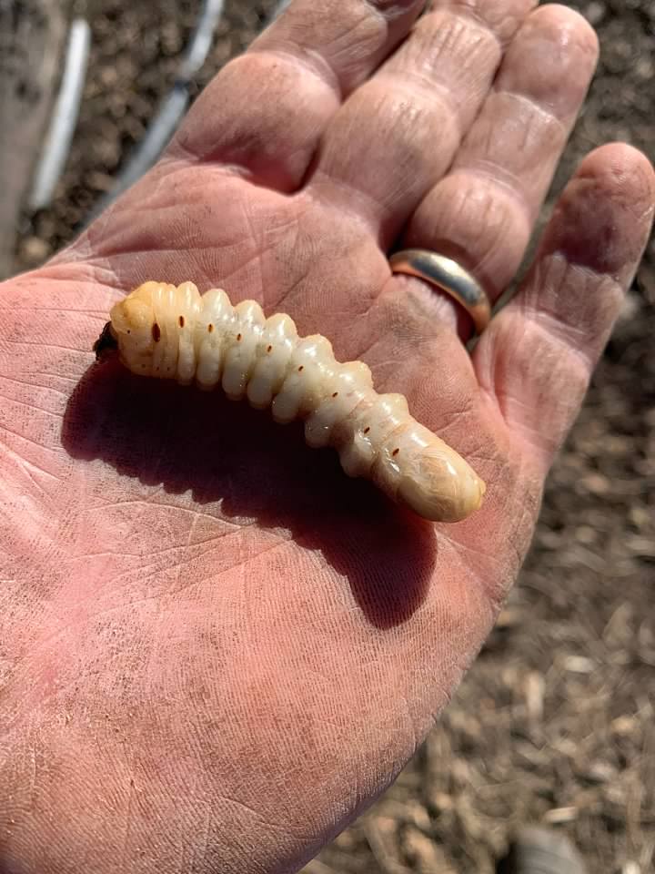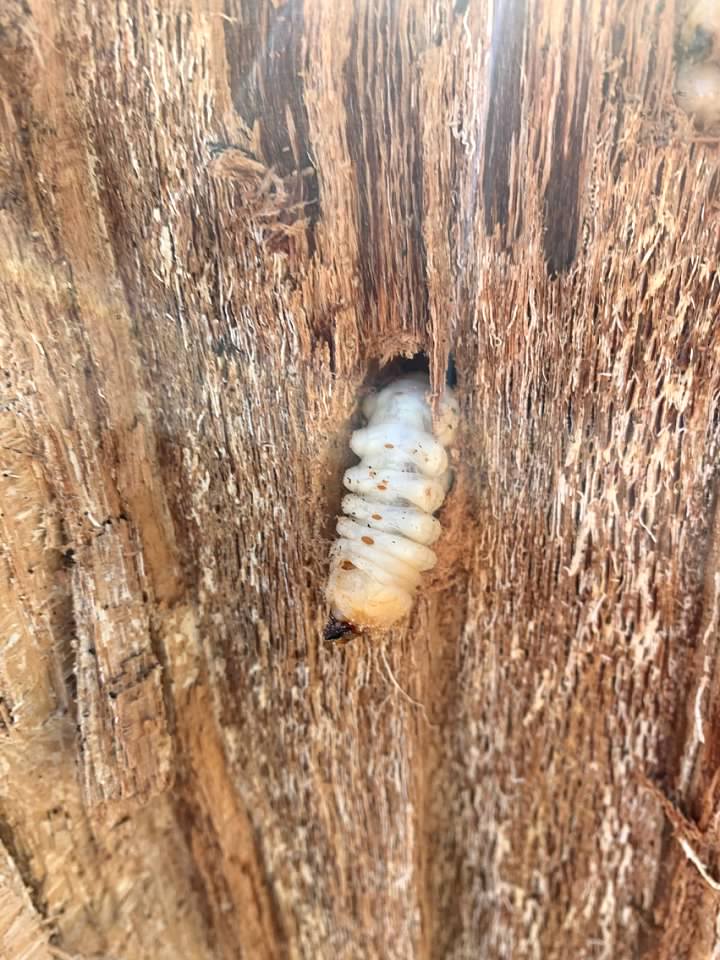 What in the world are we looking at? I don't know the scientific name, but I believe it is the larvae of the oak wood-boring beetle. I would think that this beetle is responsible for the death of my trees. The larvae is so destructive. They eat (drill) tunnels through the hard wood. That is a remarkable feat. I pulled one of the larvae out of its tunnel. He was fat and heavy in my hand. There were numerous larvae.