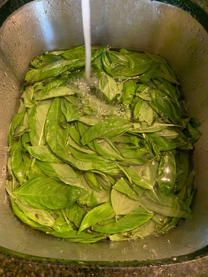 One of the other things we're making is pesto. Plenty of pesto! We have a lot of basil that popped up volunteer in the garden. We've given away many seedlings and have a bunch more. If you're in the area and would like some, get in touch and I'll pot one or two up for you. We'll pick 8 cups of pesto leaves packed to make a big batch of pesto.