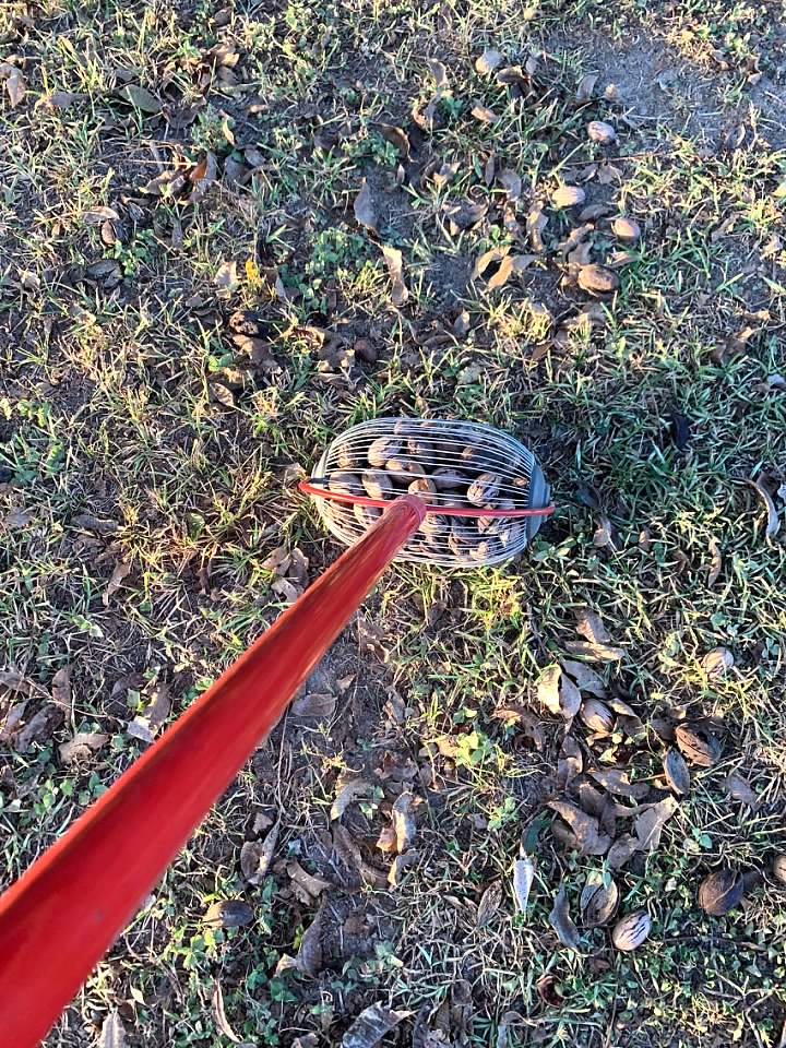 That contraption is a back-saver. As you get older, I've learned, you come to appreciate things like this so you don't have to constantly bend over. This is like the slinky we used to play with as kids, you roll it and the pecans go inside until its full.