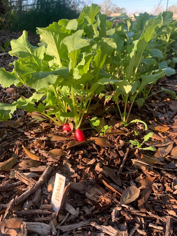 The freeze wrecked the peppers and eggplant. We picked all the remaining fruit off of them and cut down the freeze-damaged plants. Everything is brown now in the garden, except for bright green leafy things like kale, swiss chard, mustard greens, turnips, and things like radishes shown below. The red radishes contrasted against the radish greens in the morning sun are pretty. I don't get that fired up about cut up radishes in a salad. I'll enjoy them like that, but Tricia makes a radish dip that's quite addictive. She'll take a few nice sized radishes and put them in a food processer and mince. To that shell mix in a softened block of cream cheese and a little salt, pepper and chili powder.