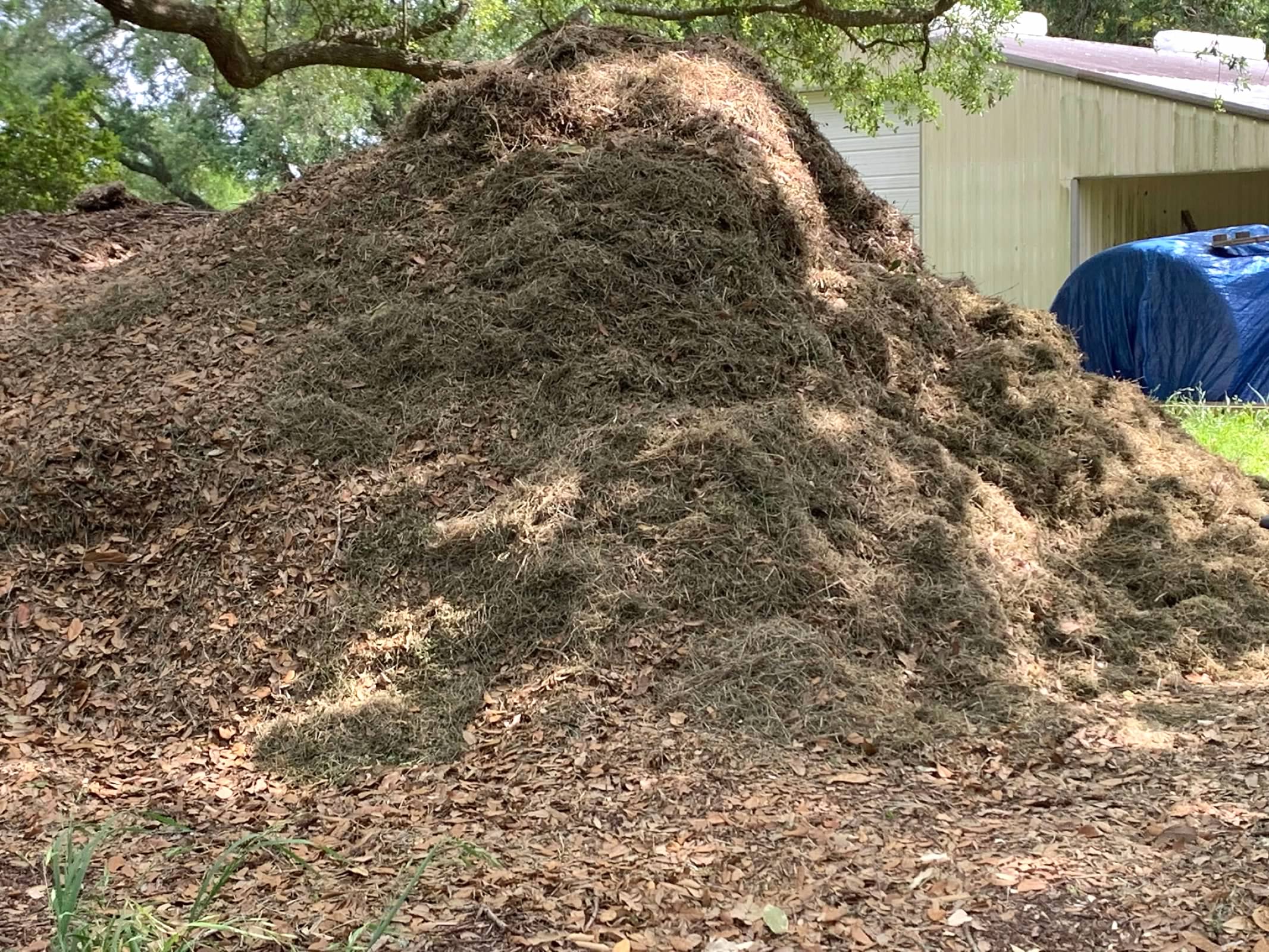The pile (or mountain) is six feet tall! You can see the wagon that I use to gather the raked up leaves and grass and then dump on the pile. I use a pitch fork to continue piling it higher and higher. It took me several days to do, but I got it done. Yes, there are easier and more efficient ways of doing this, but I only do this for the first mowing of the season, so it doesn't make sense to spend money for an attachment to the mower to bag all the clippings. Every successive mow, I simply mulch the leaves and grass back into the lawn.