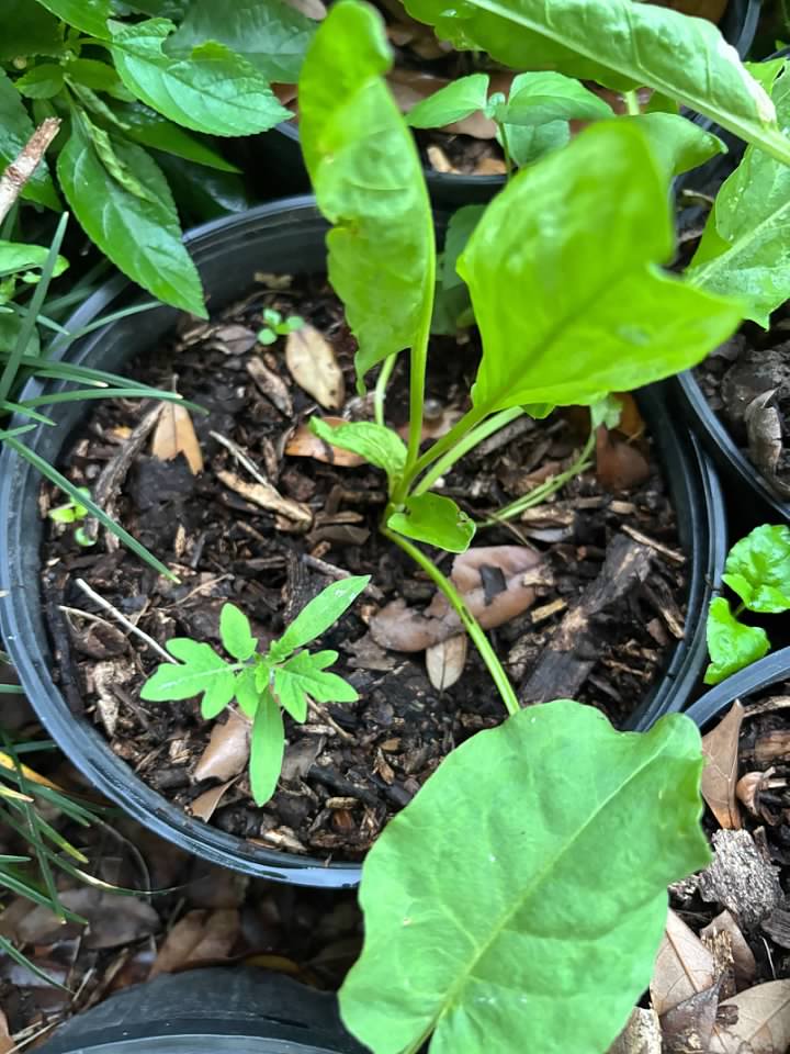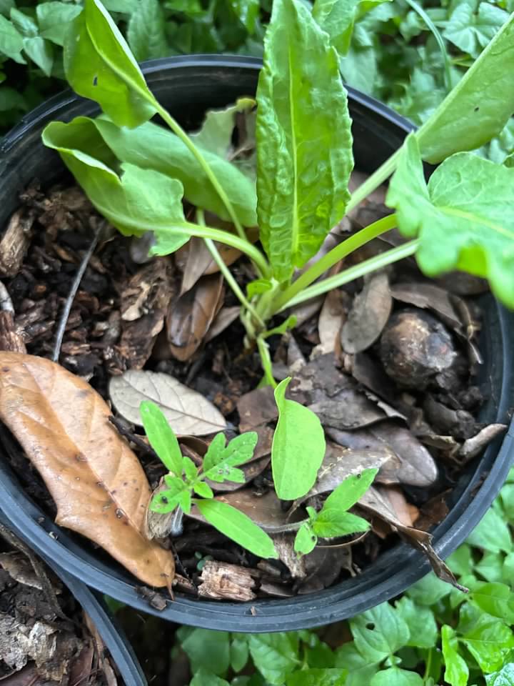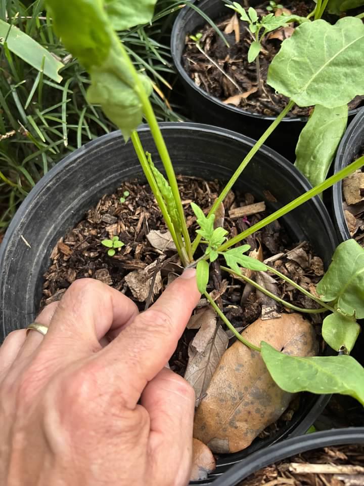 I'll use that dirt for planting other crops in.  In six pots, I've got some herbs growing, specifically French Sorrel.  The leaves on this plant are so tasty!  This afternoon while watering the sorrel, something caught my eye.  I'm pointing at it, in case you don't see it.