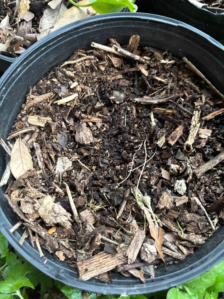 Some of the seeds don't germinate.  That is to be expected, especially when I'm using saved seed or seed that's a few years old.  I dump all the rich dirt from those pots in which the seeds didn't germinate into a bigger pot to reuse later.  In fact, here's one now: