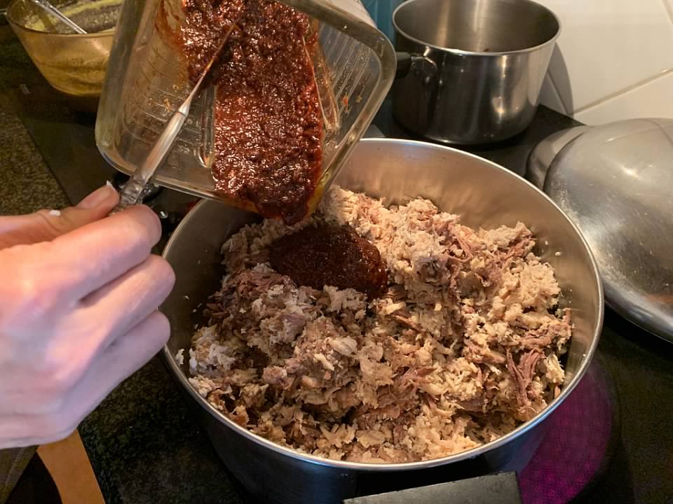 In the background, Tricia was cooking the meat for the tamales and made some broth and saved that to pour into the masa.