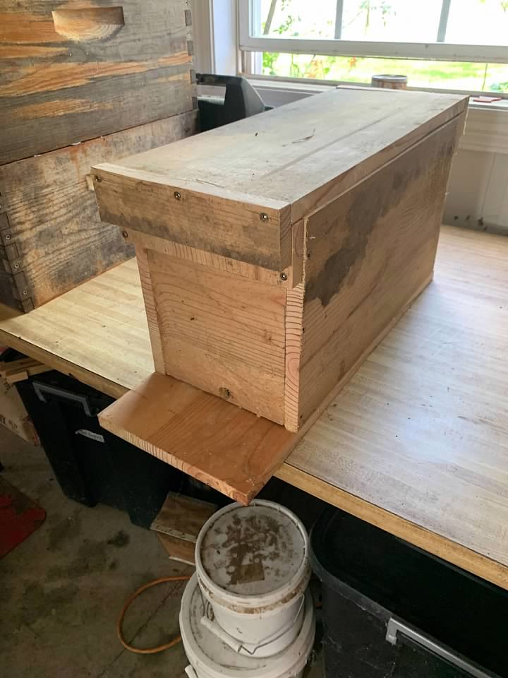 After not many clicks, I found plans and was busy with my cut list. The best part was it was free. Everything needed to make it I already had on hand from the screws to the 1 x 12 that I had up in the rafters in the barn leftover from a project ten years ago. I am not a carpenter. My cuts aren't square. The finished product is never pretty. But I've found over the years that the animals don't care, and I don't think the honeybees will care either. It didn't take long and the nuc was finished.