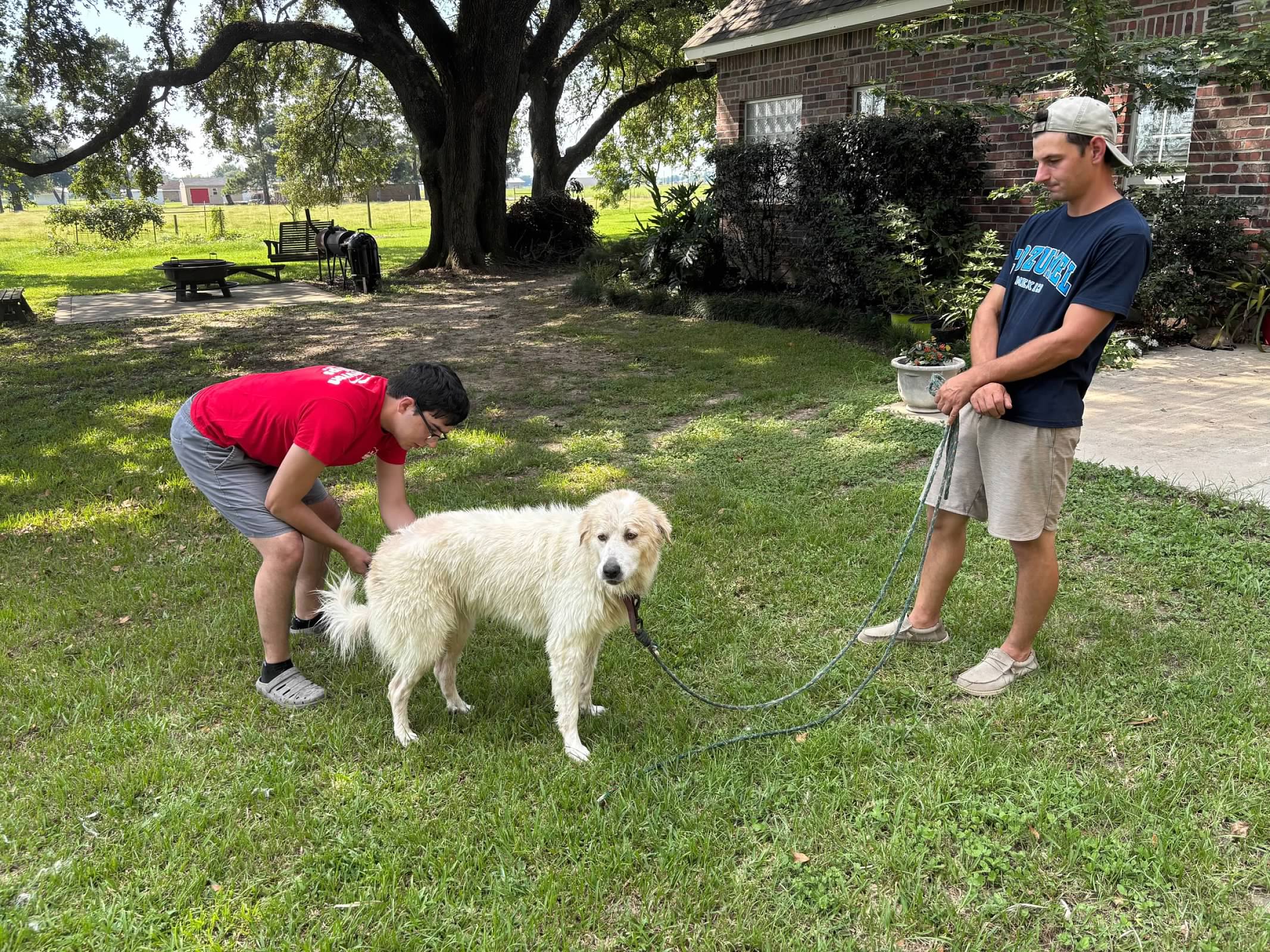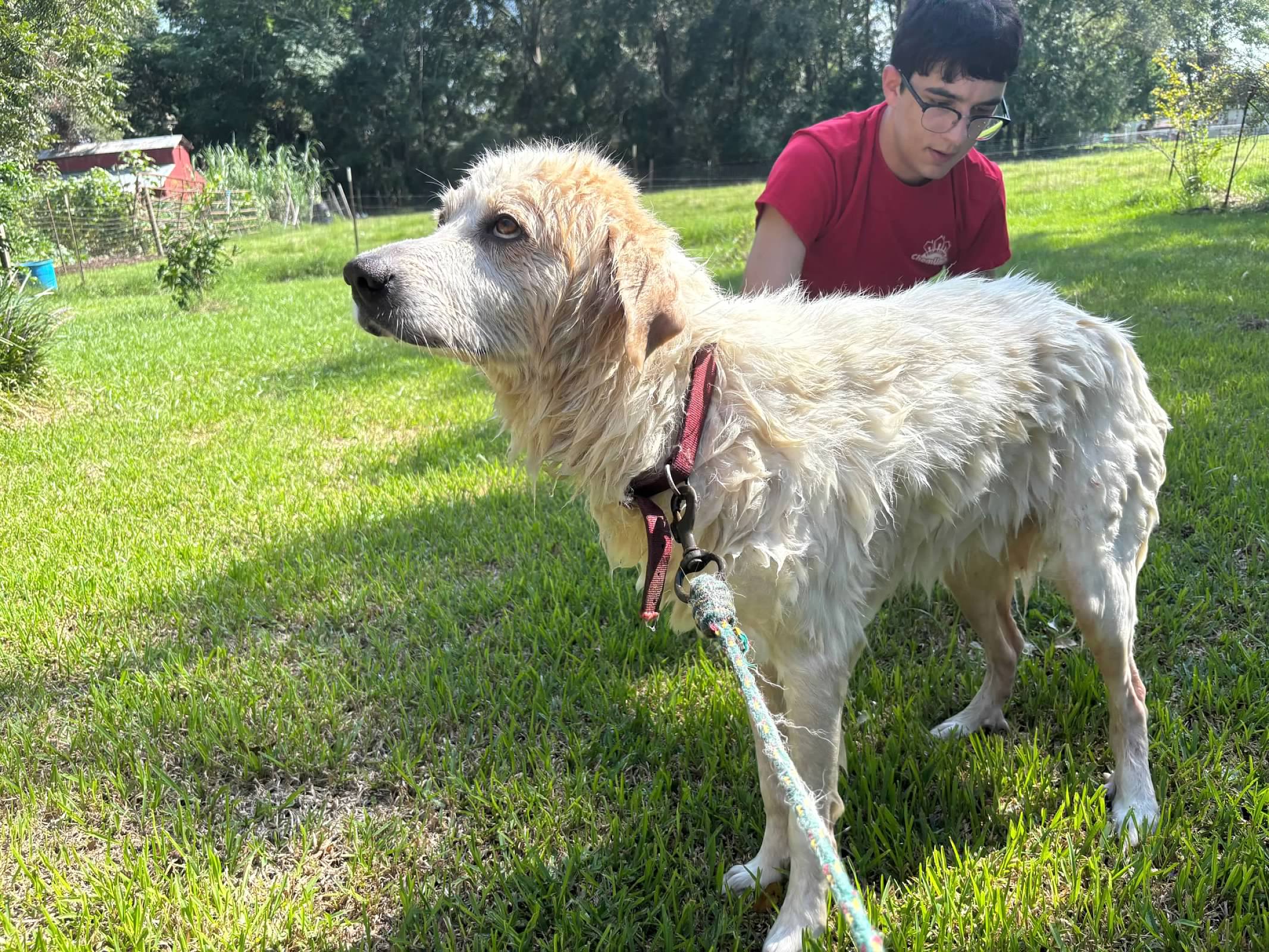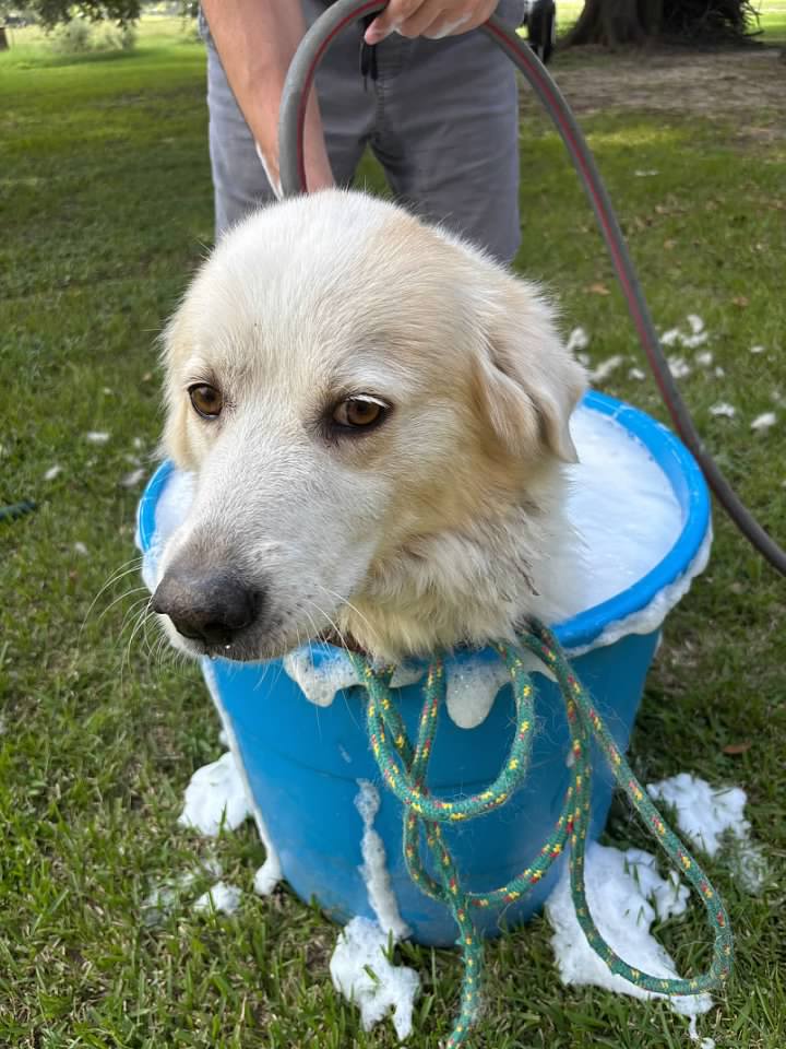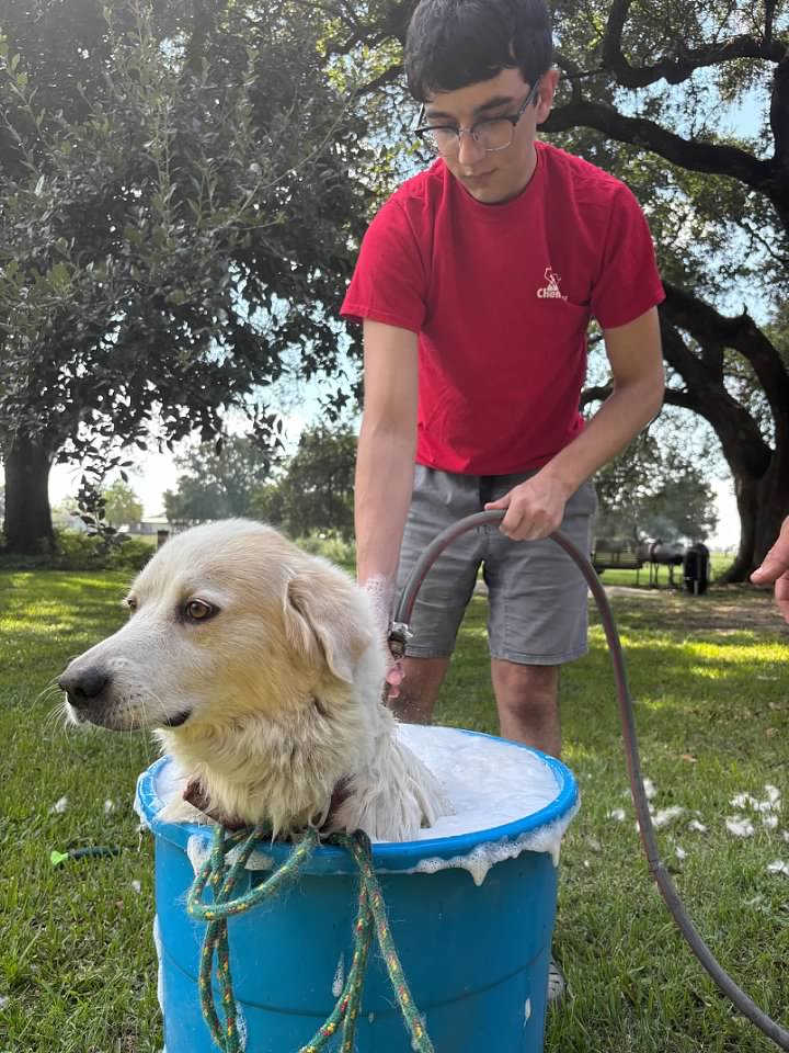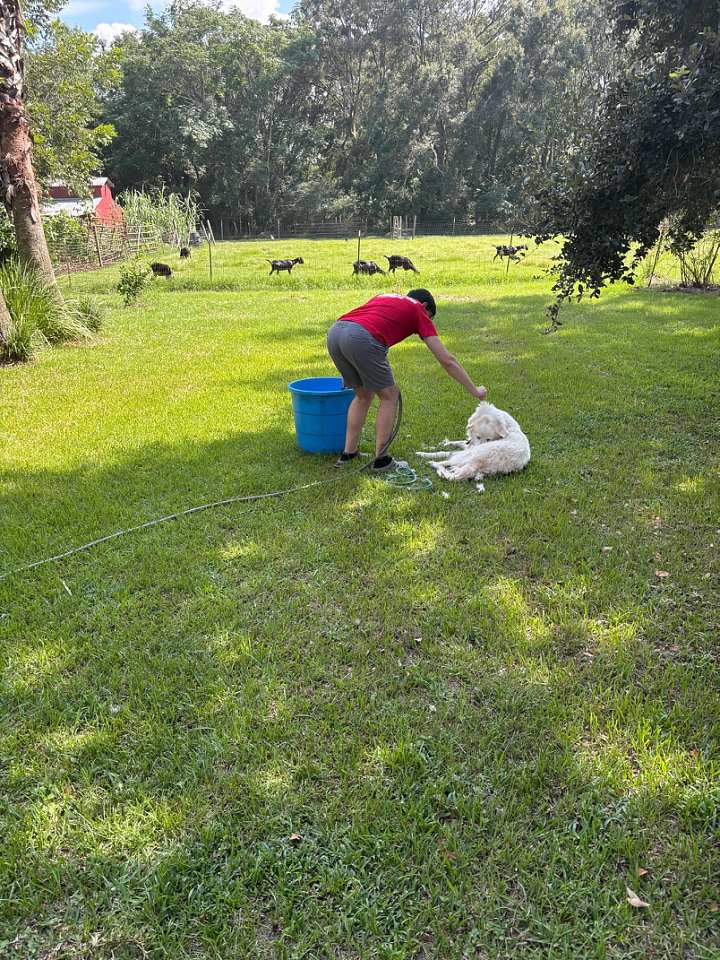 Our Great Pyrenees, Belle, is 5 1/2 years old. I can remember giving her a bath twice. Now, that may seem like animal abuse to some. There is a thriving industry of dog groomers, but Belle will never go to one. She's a working livestock guardian dog and instinctively does her duty day in and day out. But the other day, Belle walked by us and Benjamin said, "Belle, you stink!" He put it on his list to give her a bath.